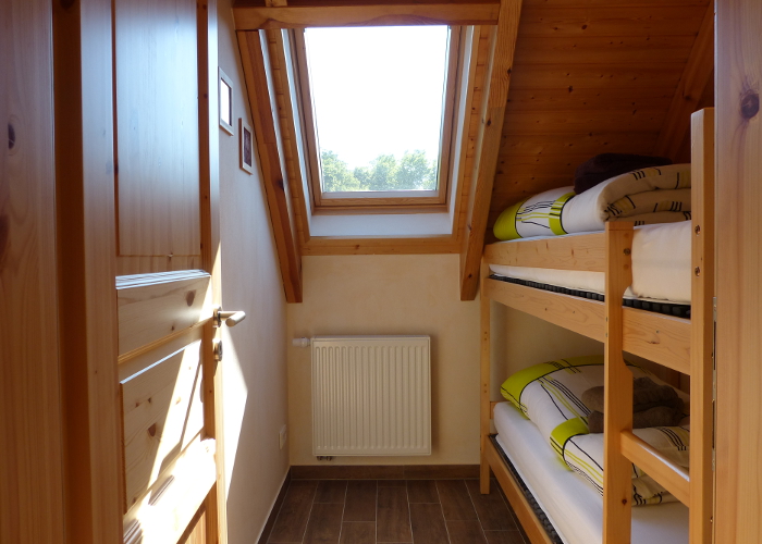 Sie besteht aus einem Wohnraum mit offener Küche, Bad (Dusche, WC, Haarfön), einem Schlafraum mit Dopelbett, einem Schlafraum mit Etagenbett.